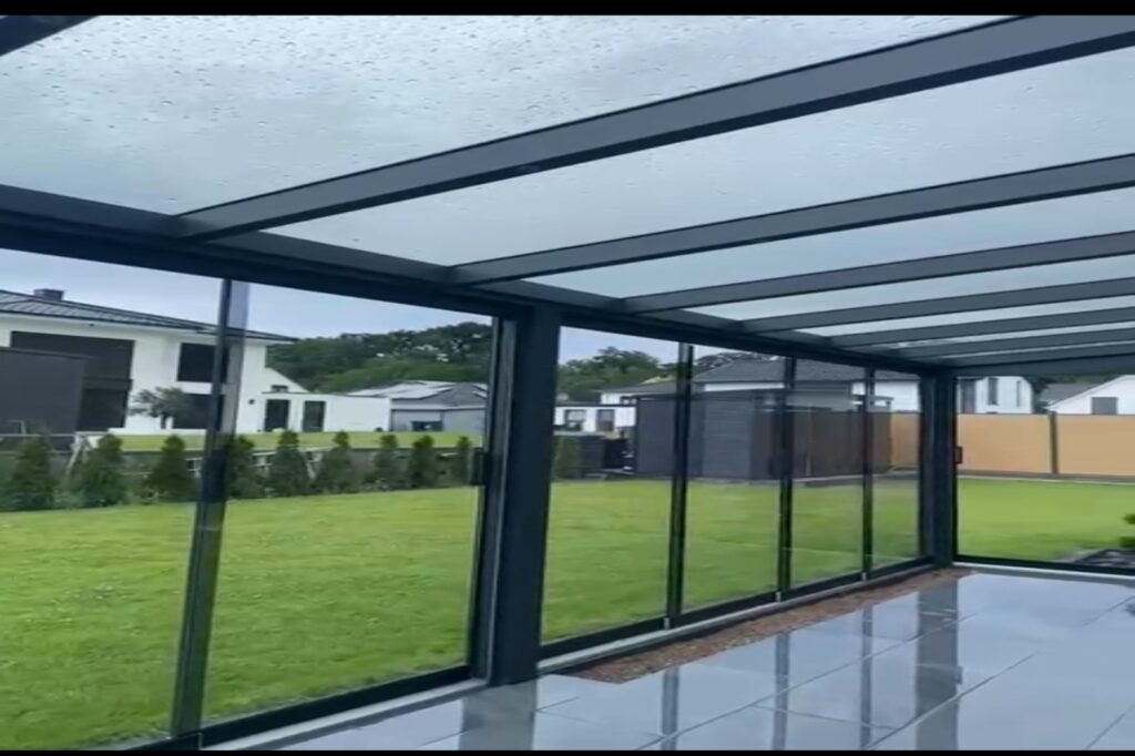 Die integrierte Regenrinne im Pfosten sorgt für einen unsichtbaren und effektiven Wasserablauf – ganz ohne störende Fallrohre. Optional können Glasschiebetüren eingebaut werden, die Ihre Überdachung wetterfest machen.
