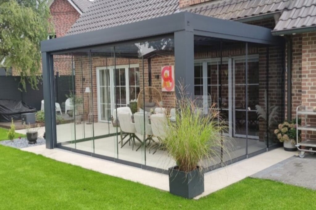 Ja – Seitenwände aus Aluminium oder Polycarbonat bieten zusätzlichen Wind- und Sichtschutz. Auch Glasschiebetüren sind möglich.